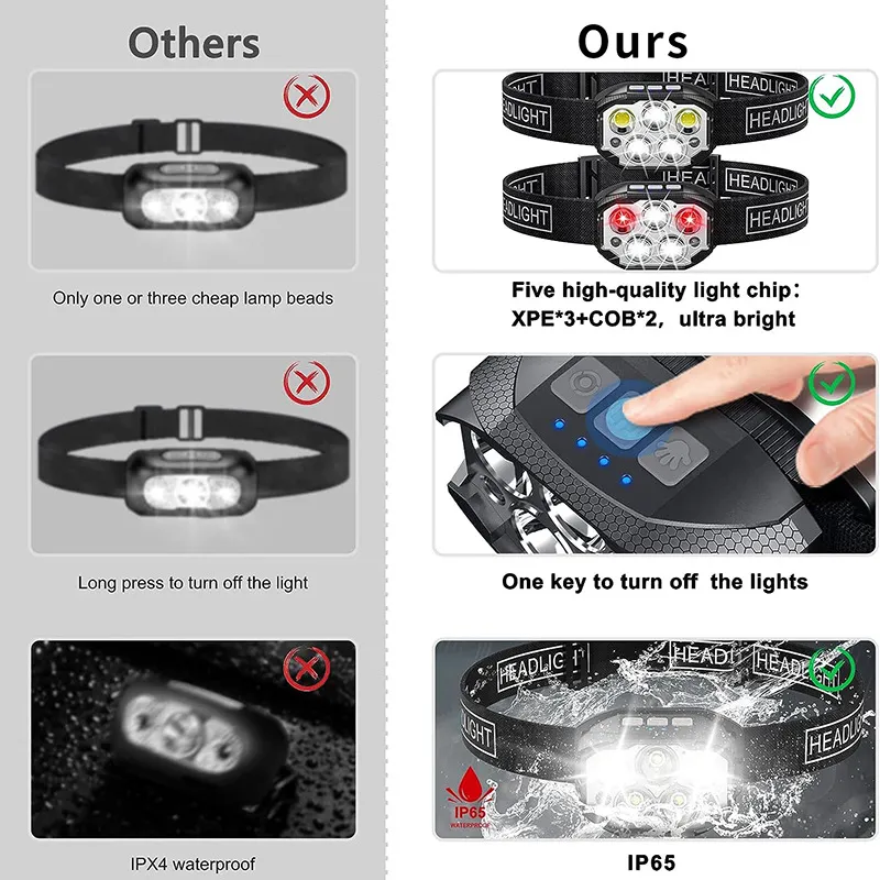 Mini induction headlight XPE+COB light bead red warning USB charging walking headlight